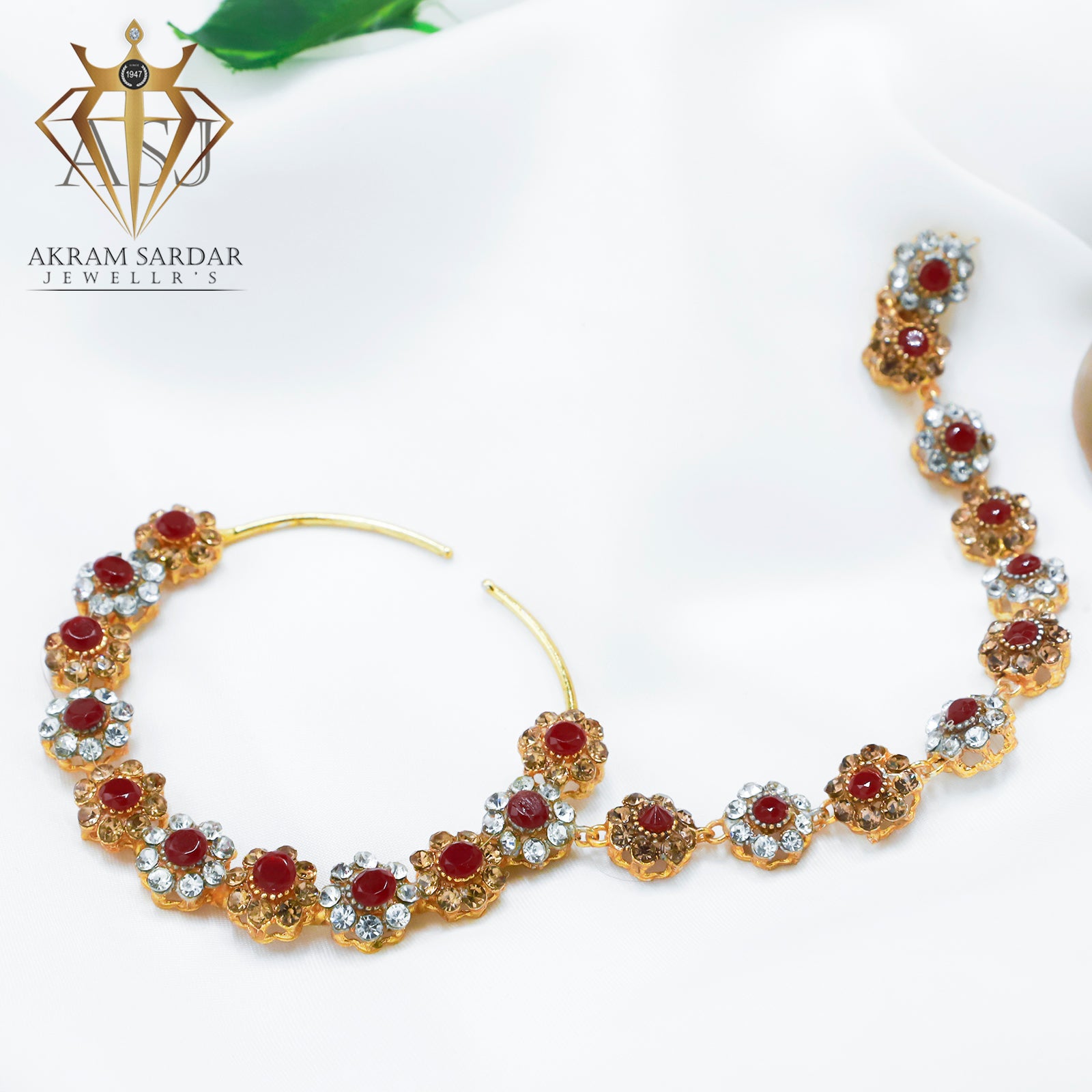 A bridal nose ring, often known as a nath, is a traditional and elegant piece of jewelry worn by brides to enhance their facial features and symbolize cultural heritage. Crafted from gold, silver, or adorned with pearls, beads, or gemstones, it varies in size and style across regions. Whether it's a delicate stud or an elaborate hoop connected by a chain to the hair or ear, the bridal nose ring adds a timeless charm and regal touch to the bridal ensemble.