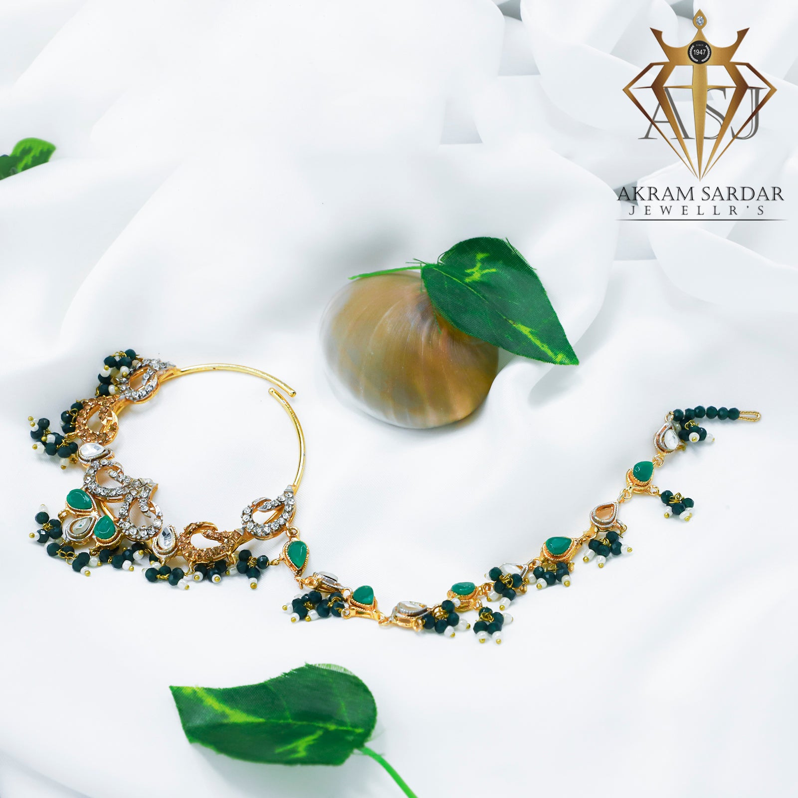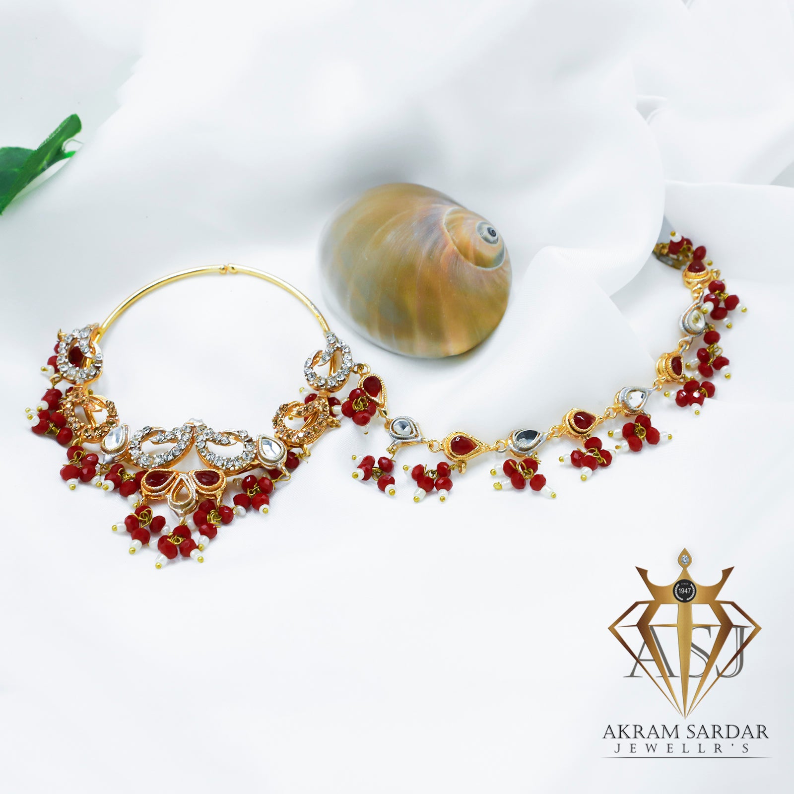 A bridal nose ring, often known as a nath, is a traditional and elegant piece of jewelry worn by brides to enhance their facial features and symbolize cultural heritage. Crafted from gold, silver, or adorned with pearls, beads, or gemstones, it varies in size and style across regions. Whether it's a delicate stud or an elaborate hoop connected by a chain to the hair or ear, the bridal nose ring adds a timeless charm and regal touch to the bridal ensemble.