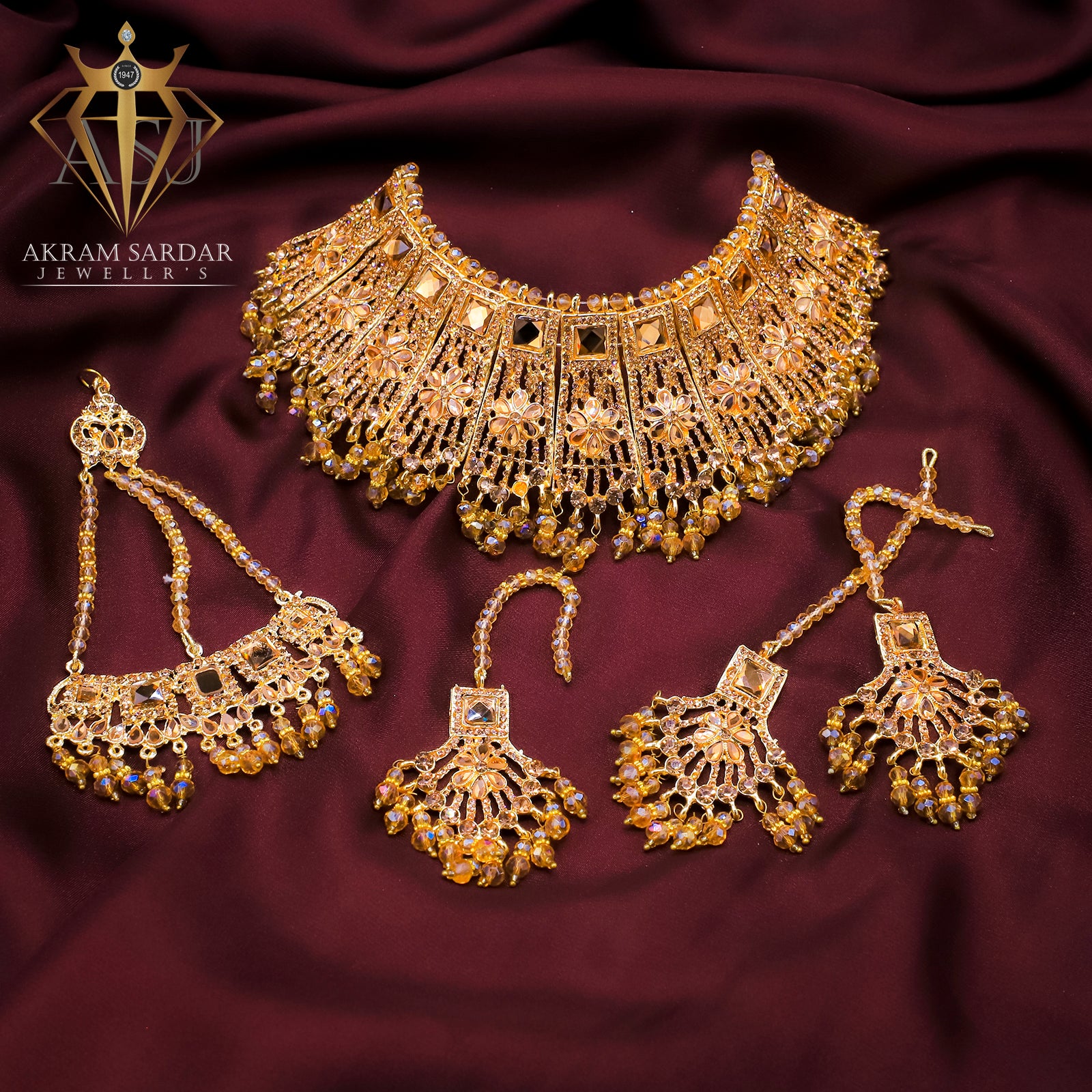 The Collar Bridal Set combines intricate detailing with contemporary design elements, offering a perfect balance of traditional charm and modern flair. Crafted from high-quality materials like gold, diamonds, and precious gemstones, this set ensures you shine with grace and confidence as you walk down the aisle.