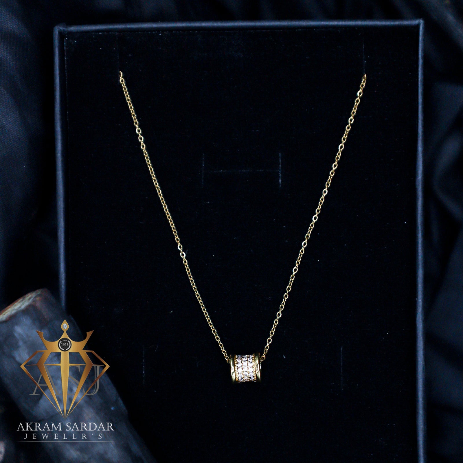 A unique and trendy pendant featuring a drum-shaped charm with a crystal stone at its center. The golden base with silver accents adds a modern twist to classic style.