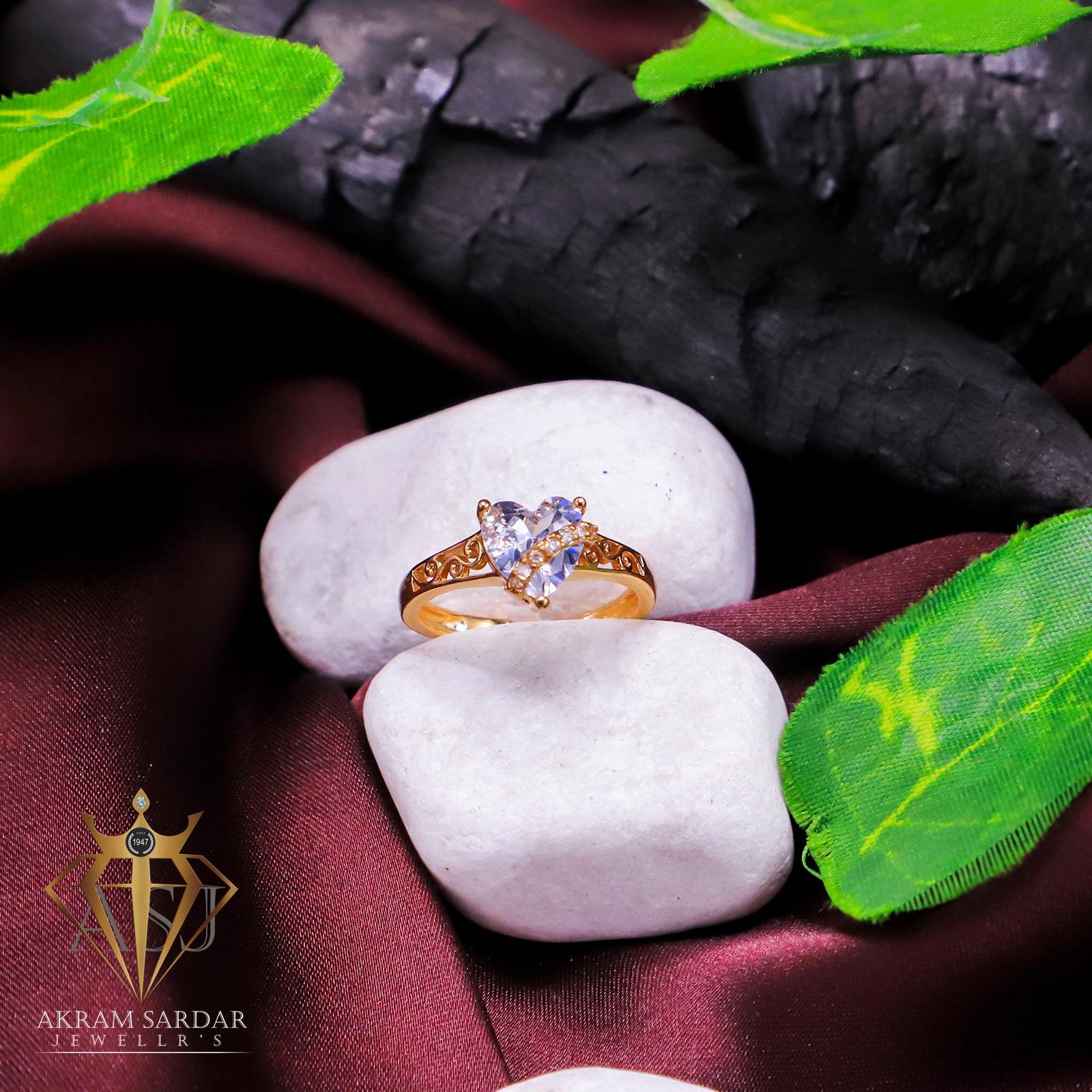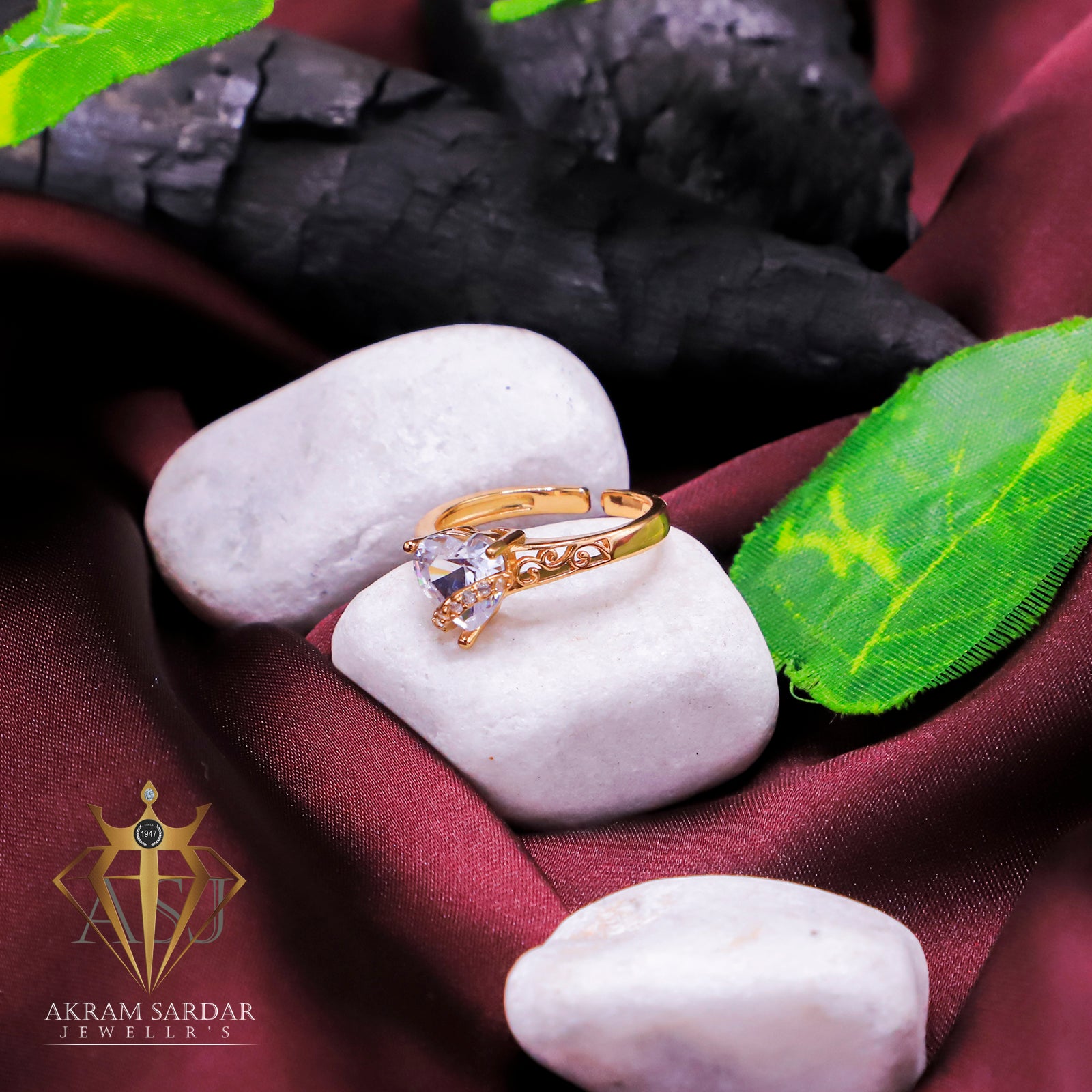 This golden ring features a heart-shaped stone at the center with a curved band set with white stones Adjustable size